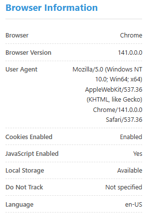 It shows your browser version, supported features, and cookie settings. This helps developers ensure websites work properly across all browsers.