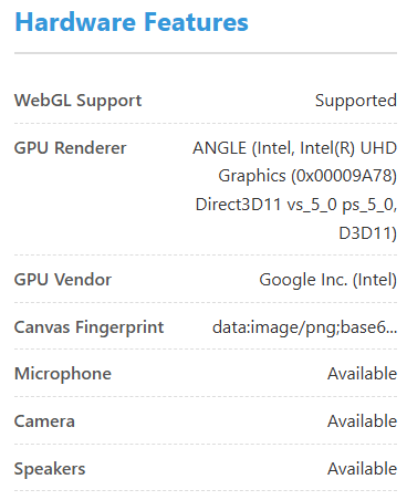 For gamers and designers, it shows GPU details, including WebGL support. This is useful if you want to test how your system handles graphics.