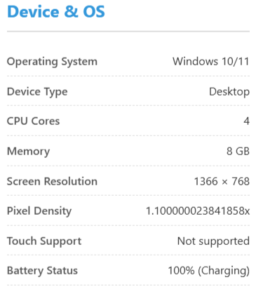 It’s like a quick health check for your device. You can instantly see your computer’s details, such as memory, processor, browser, and internet connection, all in one place.