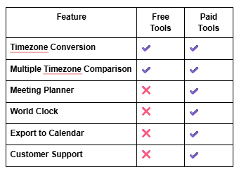 Free tools offer basic time conversions, while paid tools offer additional features like meeting planners, world clocks, and calendar exports.
