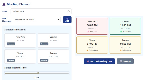 For international businesses, time zone management is critical. With teams spread across different regions, coordinating schedules and meetings can quickly become a logistical nightmare. A timezone calculator allows businesses to streamline their operations by providing accurate time conversions and optimizing meeting schedules.